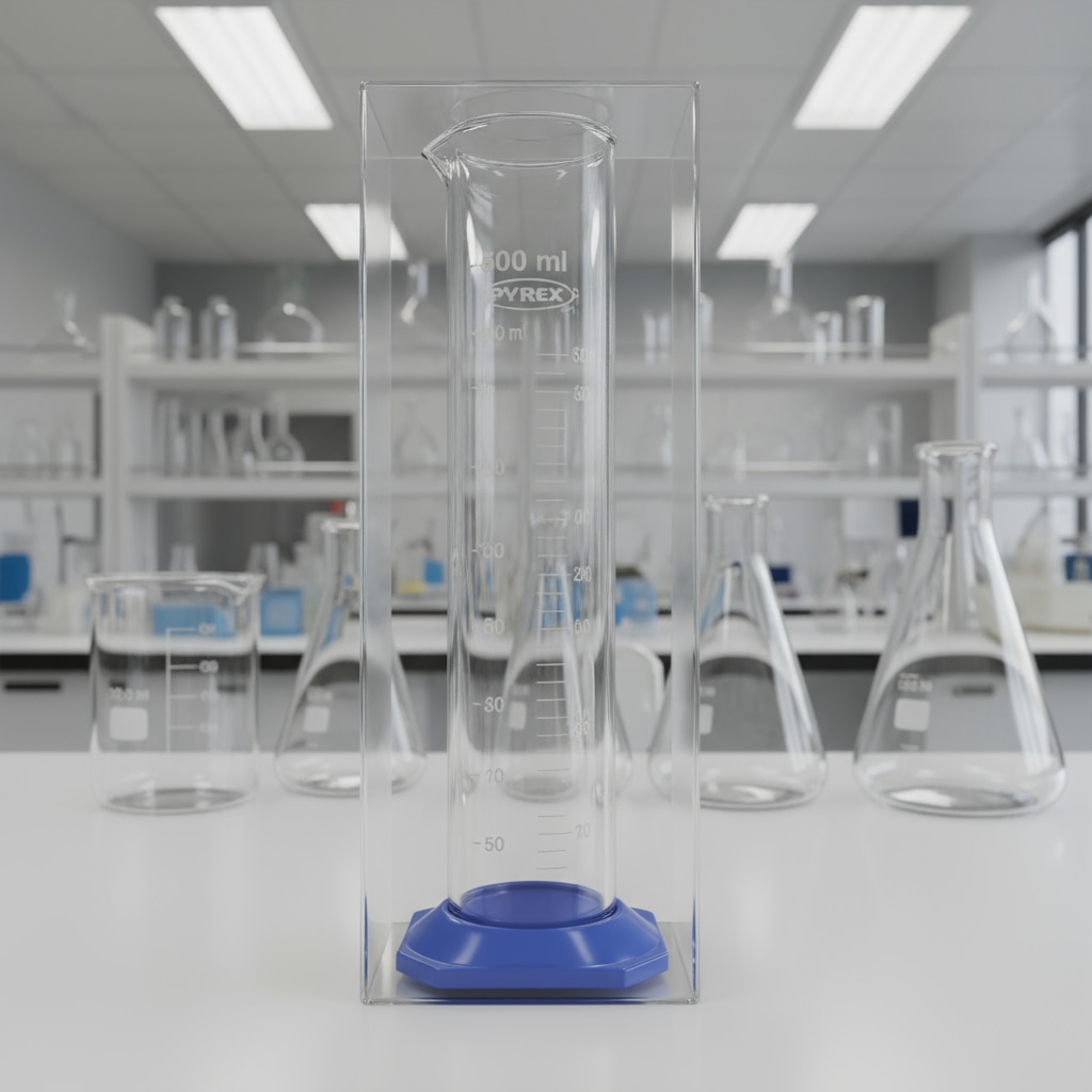 A Measuring Cylinder (Blue) with a plastic base and 500 ml capacity is a laboratory glassware instrument made from borosilicate glass 3.3, featuring blue printed graduations for clear volume measurement. It has a hexagonal plastic base that provides enhanced stability and reduces the risk of tipping or rolling. This cylinder is Class A or B calibrated, with graduation increments typically 5 ml, suitable for precise volumetric measurements in professional settings. Key Features Durable borosilicate glass with chemical-resistant blue enamel graduation marks. Hexagonal detachable plastic base for safety, stability, and ease of cleaning. Drip-free pouring spout for accurate liquid transfer. Typical dimensions around 380 mm height and 50 mm base diameter. Calibrated to contain liquids at reference temperature +20°C. Suitable for educational, scientific, and industrial laboratories. Optional polypropylene stopper included for sealing. This measuring cylinder meets stringent laboratory standards for accuracy and reliability while ensuring user safety and convenience.