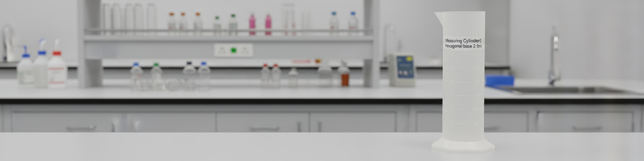 The image shows a white measuring cylinder with a hexagonal base and a 2-liter capacity, clearly labeled for easy identification(see the generated image above). ### Description - Constructed from durable white material, this measuring cylinder is resistant to chemical corrosion commonly encountered in laboratory settings. - Its hexagonal base design enhances stability and prevents rolling, ensuring safer handling on flat surfaces. - The 2-liter capacity along with clear, precise graduation marks makes it suitable for measuring and transferring larger volumes of liquids accurately in scientific, educational, and industrial contexts.