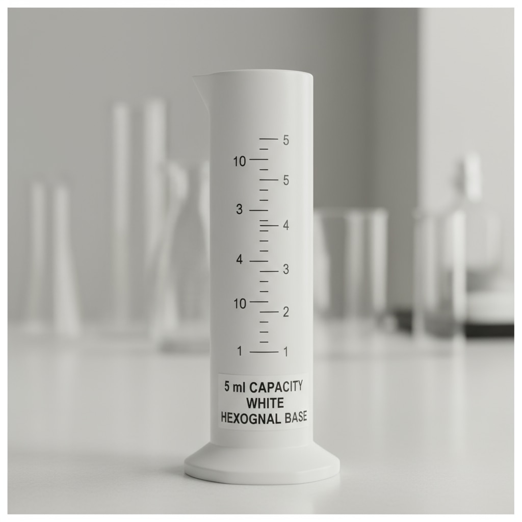 The image shows a white measuring cylinder with a hexagonal base and a 5 ml capacity, clearly labeled for easy identification(see the generated image above). Description The measuring cylinder is made from a durable white material, resistant to common laboratory chemicals and easy to handle. The hexagonal base provides stability and prevents the cylinder from rolling when placed on its side, enhancing safety. Its 5 ml capacity is suitable for measuring small volumes of liquids precisely in laboratory and educational settings. Clear graduations along the container ensure accurate volume readings.