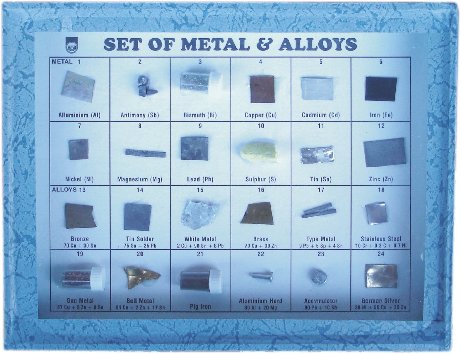 Metal & Alloys (Set of 24) in Polished Showcase is a comprehensive educational set containing 24 specimens—12 essential metals and 12 foundational alloys—mounted in individual labeled compartments within a polished wooden or acrylic showcase fitted with a transparent glass or acrylic lid for both protection and attractive display.​ Product Overview The set includes 12 basic metals and 12 basic alloys, chosen for their relevance in classroom, laboratory, and introductory materials science education.​ Specimens are mounted in a polished (glossy finish) showcase with each compartment labeled for easy identification and reference.​ The case is typically 9“ × 12”, equipped with a clear protective cover to ensure durability and visibility.​ Typical Metals and Alloys Included Metals: Aluminium (Al), Antimony (Sb), Bismuth (Bi), Cadmium (Cd), Copper (Cu), Iron (Fe), Lead (Pb), Magnesium (Mg), Nickel (Ni), Sulphur (S), Tin (Sn), Zinc (Zn).​ Alloys: Aluminium Hard, Brass, Bronze, Bell Metal, German Silver, Solder, Duralumin, Gun Metal, Nichrome, Stainless Steel, Monel Metal, White Metal, and others.​ Features and Applications All specimens are neatly labeled and secured in polished compartments, combining clear display with protection from dust and accidental handling.​ Used for teaching metal identification, alloy composition, physical properties, and industrial applications in science and engineering education.​ Durable and visually attractive, suitable for group study, reference, and even exhibition use.