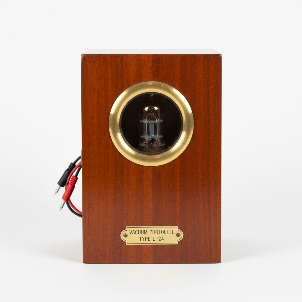 A vacuum-type photo cell (phototube) is a laboratory device consisting of a vacuum-sealed glass tube with a photocathode and an anode inside. When light enters through an aperture, photons hit the photocathode's surface releasing electrons via the photoelectric effect. These electrons are attracted to the anode, generating a current proportional to the light intensity. The tube is mounted in a wooden box with a transparent or open aperture for light entry, providing environmental protection and easy handling for educational or experimental purposes. This arrangement allows precise measurement of light energy based on the photoemission of electrons in a vacuum, useful in physics laboratories for demonstrating photoelectric effects and light detection principles. The vacuum environment ensures free electron travel between electrodes, enhancing sensitivity and accuracy.
