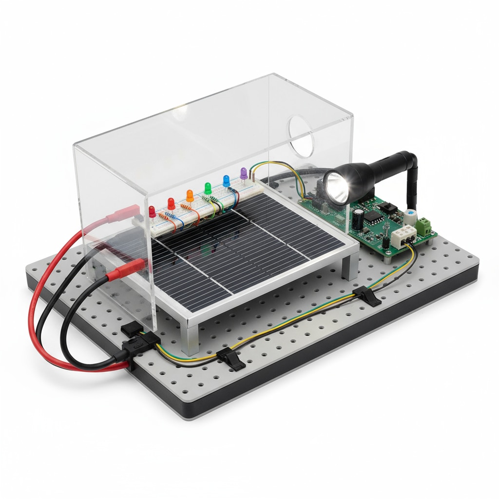 Description The apparatus consists of a photoelectric solar cell (typically selenium type), a filament light bulb with adjustable power supply, and a set of colored optical filters. The light emitted from the filament bulb passes through different color filters and falls on the solar cell, generating a photoelectric current. Voltage and current from the solar cell are measured using sensitive digital meters connected to the setup. By varying the light intensity and wavelength (using filters), and measuring the stopping voltage, the experiment calculates the Planck’s constant according to Wien’s displacement law and the photoelectric equation e V s = h ν − ϕ eV s =hν−ϕ. The apparatus includes adjustments for light intensity and alignment, ensuring accurate measurements of photoelectric response at various frequencies. This setup provides a hands-on experimental demonstration of the quantum nature of light and the dependency of emitted photoelectrons on frequency, essential for understanding fundamental physics principles.
