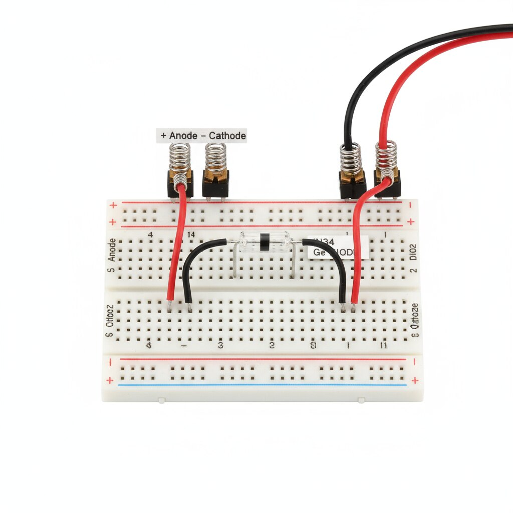 The PN Junction Diode on Board (IN34 or equivalent) is a fundamental semiconductor device used to allow current to pass in one direction while blocking it in the opposite direction, widely used in signal detection, rectification, and switching applications. Key Features Construction: Made using a P-type and N-type semiconductor forming a junction, often encapsulated on a board for easy integration. 1N34 Germanium Diode: Typically employed as the IN34 equivalent, this diode has a low forward voltage drop of around 0.2 to 0.3 volts and low leakage current, making it ideal for high-frequency and low-signal applications. Peak Inverse Voltage (PIV): Around 60-65 volts, protecting the diode from reverse voltage damage. Maximum Forward Current: Usually around 50mA average rectified current, with surge capability up to 0.5A peak forward current. Temperature Range: Operates efficiently within -55°C to +75°C, suitable for various environmental conditions. Characteristics: The diode exhibits excellent linearity and low junction capacitance, which helps in detecting and demodulating radio, TV, FM signals, and other communication signals. Applications: Widely used in AM/FM detectors, TV audio detectors, ratio detectors, RF input probes, and for signal demodulation in radio receivers. Working Principle The diode consists of a PN junction where charge carriers (electrons and holes) move under bias conditions. Forward bias allows current flow with a small voltage drop (~0.3V for germanium diodes). Reverse bias blocks current flow except for a very small leakage current until breakdown voltage is reached. This property enables effective rectification and signal detection in electronic circuits. This PN junction diode on board featuring the IN34 or an equivalent germanium diode is a critical component for low-voltage, high-frequency signal applications, offering reliability, stability, and precise performance in communication and electronic devices.
