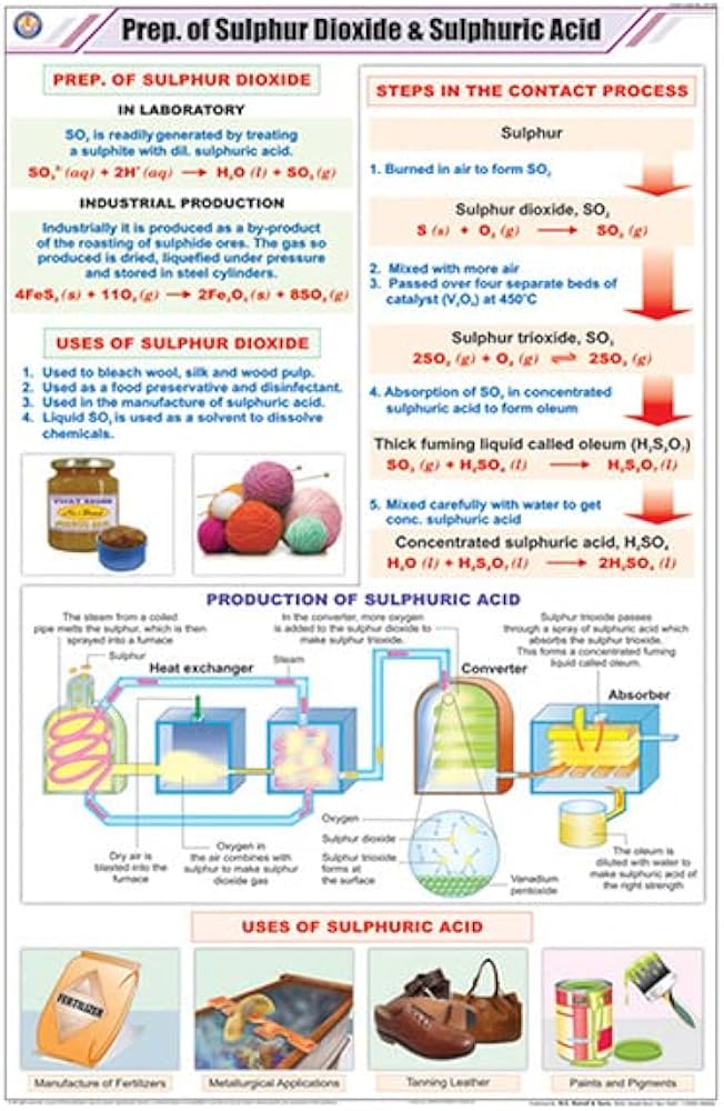 The educational chart titled “Preparation of Sulphur Dioxide & Sulphuric Acid” (55x90cm) typically illustrates both the laboratory and industrial methods for preparing these substances, with stepwise reactions and process diagrams suited to classroom use.​ Preparation of Sulphur Dioxide Laboratory Method: Sulphur dioxide is commonly prepared by heating copper with concentrated sulphuric acid or by reacting sodium sulphite with dilute acid such as HCl.​ Example reactions: Cu + 2 H 2 SO 4 → CuSO 4 + 2 H 2 O + SO 2 Cu+2H 2 SO 4 →CuSO 4 +2H 2 O+SO 2 ​ Na 2 SO 3 + 2 HCl → 2 NaCl + H 2 O + SO 2 Na 2 SO 3 +2HCl→2NaCl+H 2 O+SO 2 ​ Industrial Process: Sulphur is burned in air to form sulphur dioxide: S + O 2 → SO 2 S+O 2 →SO 2 ​ Alternatively, metal sulfide ores are roasted in air: 4 FeS 2 + 11 O 2 → 2 Fe 2 O 3 + 8 SO 2 4FeS 2 +11O 2 →2Fe 2 O 3 +8SO 2 ​ Preparation of Sulphuric Acid (Contact Process) Step 1: Production of sulphur dioxide ( SO 2 SO 2 ) by burning sulphur in air.​ Step 2: Catalytic oxidation of sulphur dioxide to sulphur trioxide ( SO 3 SO 3 ) using vanadium(V) oxide as catalyst: 2 SO 2 + O 2 ↔ 2 SO 3 2SO 2 +O 2 ↔2SO 3 ​ Step 3: Absorption of sulphur trioxide into concentrated sulphuric acid to form oleum ( H 2 S 2 O 7 H 2 S 2 O 7 ): H 2 SO 4 + SO 3 → H 2 S 2 O 7 H 2 SO 4 +SO 3 →H 2 S 2 O 7 ​ Step 4: Dilution of oleum with water to yield sulphuric acid: H 2 S 2 O 7 + H 2 O → 2 H 2 SO 4 H 2 S 2 O 7 +H 2 O→2H 2 SO 4 ​ Poster Chart Features Size: 55×90 cm.​ Content: Usually includes labeled diagrams, chemical equations, and flowcharts for both laboratory and industrial setups. Audience: Designed for secondary and higher education chemistry classrooms, durable and often laminated for frequent use.​ This chart serves as a comprehensive teaching aid for understanding both the fundamental chemistry and the industrial relevance of sulphur dioxide and sulphuric acid production.​