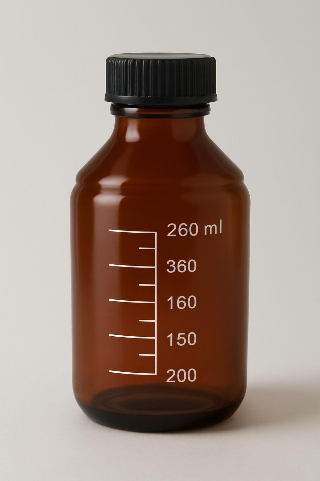 An amber reagent bottle with a screw cap and a 250 ml capacity is a specialized laboratory container designed to store light-sensitive chemicals and reagents. The amber color helps protect the contents from harmful UV and visible light, preserving the integrity and stability of light-sensitive substances. Made typically from chemically resistant glass or plastic, this bottle features a screw cap that provides an airtight and secure seal, preventing contamination, evaporation, and spillage. Its 250 ml size is ideal for smaller quantities of reagents, commonly used in analytical, pharmaceutical, and research laboratories where precise and protected storage is essential.