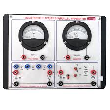 The Resistances in Series & Parallel Apparatus is designed for the experimental demonstration and verification of the laws governing electrical resistances when connected in series and parallel configurations. Description Series Connection: In a series setup, resistors are connected end-to-end, so the same current flows through each. The apparatus allows users to join multiple resistors in sequence and measure the total resistance, which is the sum of individual resistances. Parallel Connection: In a parallel arrangement, the resistors are connected at both ends across the same voltage, allowing multiple paths for current. The apparatus is built to facilitate the parallel joining of resistors and measurement of the combined resistance, which is always less than the smallest individual resistor. Features Consists of a robust base with terminals for easy connection of resistors. Multiple binding posts and slots for arranging resistors in series and parallel. Suitable for laboratory experiments, enabling accurate resistance measurement using ohmmeters or multimeters. Enhances understanding of how total resistance changes with configuration, reinforcing the principles: Series: R t o t a l = R 1 + R 2 + R 3 … R total =R 1 +R 2 +R 3 … Parallel: 1 R t o t a l = 1 R 1 + 1 R 2 + 1 R 3 … R total 1 = R 1 1 + R 2 1 + R 3 1 … This apparatus is essential for educational and experimental purposes in physics and electronics labs, demonstrating practical application of theoretical resistance formulas.
