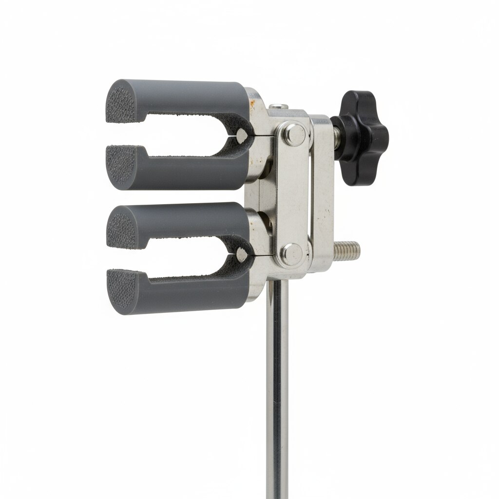 The Fisher Type Double Retort Clamp is a laboratory clamp designed to securely hold two burettes or glassware items simultaneously in a vertical position. It is typically made from die-pressed mild steel or other durable metals, providing strength and stability during chemical experiments. The clamp features V-grooved jaws that offer a firm grip on glassware and prevent slipping. It also includes a built-in boss head for easy attachment to retort stands or rods, facilitating adjustable positioning of the equipment. This clamp is widely used in titrations and other analytical procedures that require holding two burettes steady. Its construction ensures durability, corrosion resistance, and reliable performance in laboratory environments. In summary, the Fisher Type Double Retort Clamp is an essential lab accessory for precise, secure holding of laboratory glassware in dual configurations.Here is a description of the requested items: Resistance Loose Type (Pack of 100): A pack of 100 loose resistors, used in electronics to control current flow. They come loose for easy access and are suitable for prototyping and repairs. These resistors are standard size and power rating, often used in breadboards and soldered circuits. Retort Boss Head, Superior Aluminium Pressure Die Casting: A laboratory component made from high-quality aluminum via pressure die casting, used to hold rods or apparatus in place. It features two V-grooves for rods up to 16mm and is tightened with thumbscrew keys. It is corrosion resistant and lightweight for lab use. Retort Clamp, 3 Finger with rubber sleeve: A clamp for securely holding larger or oddly shaped glassware with three fingers covered in rubber sleeves to prevent slipping and damage. Made from aluminum alloy die casting for durability and corrosion resistance, used with retort stands in labs (see the generated image above). Retort Clamp, 4 Finger, Aluminium Pressure Die Casting, Brass Screw: A four-finger lab clamp that firmly holds glassware with a brass screw for adjustment. Made from aluminum pressure die casting, it is resistant to corrosion and lightweight, often coated for glass protection (see the generated image above). Retort Clamp, 4 Finger, Aluminium Pressure Die Casting, Iron Screw: Similar to the brass screw version, but with an iron screw, this durable four-finger clamp securely holds lab glassware and equipment. Features include aluminum die casting construction, corrosion resistance, and precise adjustment (see the generated image above). Retort Clamp, Fisher Type, Double: A specialized clamp designed to hold two burettes or glass pieces simultaneously. Made of die-pressed mild steel or alloy, it features V-grooved jaws with rubber coating and a built-in boss head for attachment to stands. Used in titrations and analytical chemistry. Fisher Type Double Retort Clamp Detailed Description: This clamp has V-grooved jaws for a firm grip, made from mild steel or die-cast metal. It is corrosion resistant and equipped with a boss head for easy stand mounting. It is essential in
