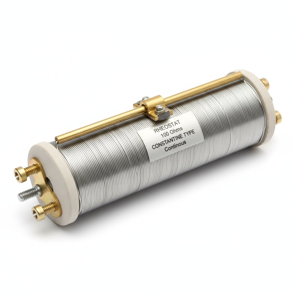 The Rheostats 100 Ohms - Continuous Constantine Type is a type of variable resistor commonly used in electrical circuits and laboratories to control the flow of current by adjusting the resistance. Key details include: It is an open-type slide wire rheostat, where a sliding contact moves along a resistive wire coil to vary resistance continuously. The resistive wire is made of Constantan, a copper-nickel alloy known for its very low temperature coefficient, ensuring resistance remains stable even with temperature changes. The device typically has three terminals: two connected to the ends of the resistance wire and one connected to the sliding contact or wiper. By moving the sliding contact, the effective resistance in the circuit changes smoothly from near zero up to 100 Ohms. Constructed with a cylindrical insulating base on which the resistance wire is wound. Commonly employed in physical and electrical experiments, teaching, and research for process control or calibration. Provides precise adjustment of current and voltage by varying resistance in a circuit.