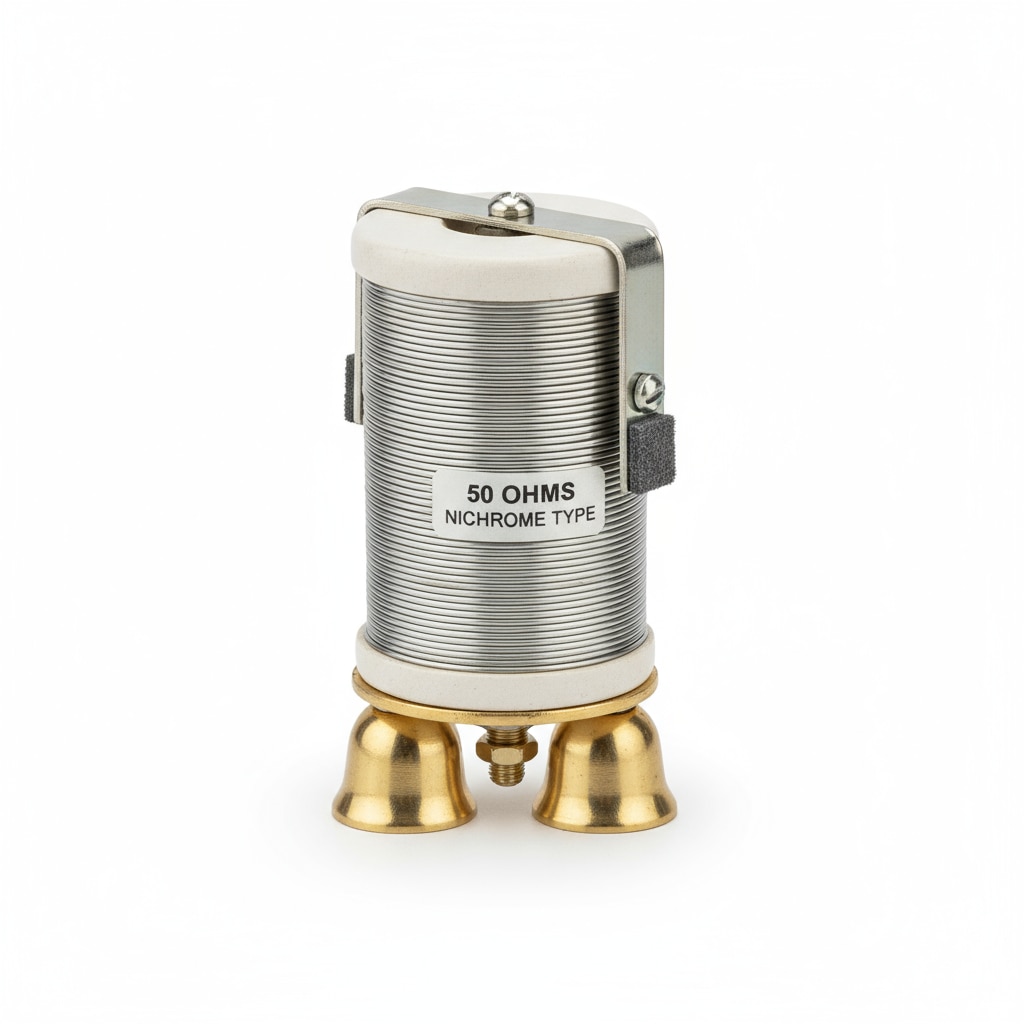 The Rheostats 50 Ohms - Nichrome Type with Bell Terminals is a variable resistor designed for precise current control in electrical circuits. Description: Composed of nichrome wire, a nickel-chromium alloy chosen for its high electrical resistance and excellent heat resistance. The resistive wire is wound on a cylindrical insulating base, coated to ensure durability and insulation. Equipped with three bell-shaped terminals—two for the ends of the resistive wire and one connected to the slider rod—allowing for use as a rheostat or potentiometer. Resistance is varied by a metal chrome-plated slider rod that moves across the coil, providing smooth and fine control over resistance values from zero up to 50 Ohms. This configuration is widely used in educational labs, experiments, and testing where precise voltage or current adjustment is necessary. Offers reliability, durability, and steady electrical performance even under varying thermal conditions.