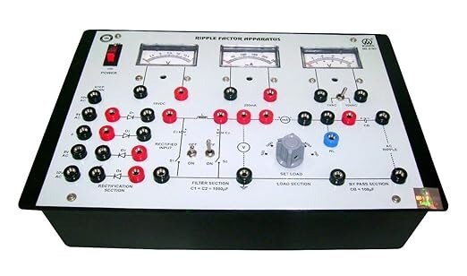 Description Circuit Design: The apparatus incorporates a rectifier section (half-wave, full-wave, or bridge), along with filtering components such as capacitors and possibly inductors to demonstrate ripple reduction techniques. Function: Ripple factor is a measure of the AC content relative to the DC level in the rectified output, typically given as the ratio of the root mean square (RMS) value of the AC component to the DC value. Operation: Users input AC voltage, and the circuit rectifies it to DC. Output terminals allow connection of voltmeters or an oscilloscope to visualize both the DC level and the superimposed ripple. Multiple filter configurations can be compared by switching between different capacitor or filter arrangements. Measurement: The apparatus facilitates direct observation and calculation of ripple factor for various filter types, helping students understand the effect of filtering and rectifier design on power supply quality. This instrument is essential in electronics and power supply labs, offering hands-on learning of rectification theory, ripple reduction, and DC power delivery improvement techniques.The Ripple Factor Apparatus is a laboratory instrument used to study and measure the amount of AC ripple present in the output of rectifier circuits, providing insight into the effectiveness of filtering methods. Description Rectifier and Filter Stages: The setup consists of rectifier circuits (such as half-wave, full-wave, or bridge), followed by various filter combinations (capacitors and/or inductors) to smooth the DC output. Measurement: Output test points allow the user to measure both the DC level and the remaining AC ripple using voltmeters and/or an oscilloscope, facilitating the calculation of the ripple factor (the ratio of the RMS value of the AC component to the DC value). Function: By switching between different filter types or capacitor values, users can observe directly how filtering reduces ripple and improves DC quality, helping to understand practical aspects of power supply design. Educational Value: The apparatus is designed for direct, hands-on analysis of ripple and filtering performance, reinforcing theoretical lessons in electronics and power supply engineering. This device is essential for practical training in rectification, filtering, and quality assessment of DC power supplies.