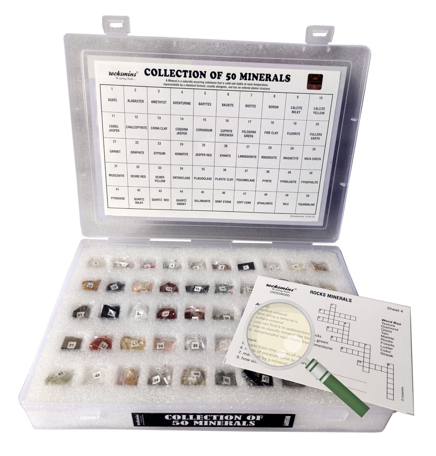 A “Rock & Mineral (set of 50) in Plastic Tray Box” is an advanced educational collection featuring 50 different rock and mineral specimens, each housed in its own compartment within a durable plastic tray—designed for organized classroom, laboratory, or museum display.​ Product Description The set typically represents 25 rock types (including igneous, sedimentary, and metamorphic varieties) and 25 mineral specimens, providing a comprehensive overview of earth materials.​ Each specimen is securely placed in a separate slot within a compartmentalized plastic tray, ensuring visibility, easy access, and minimizing risk of contamination or mixing.​ Tray dimensions commonly range from 34×24×5 cm to 14×7.25×1.25 inches, depending on the supplier.​ Features All specimens are properly labeled or numbered for identification, with an accompanying key or guide for educational reference.​ Made for repeated classroom handling, introductory earth science lessons, and detailed observation of specimen properties such as color, luster, hardness, and texture.​ The set may come with supporting educational materials, such as worksheets or activity cards.​ Typical Specimen List Rocks: Granite, Basalt, Marble, Limestone, Shale, Slate, Sandstone, Gneiss, Conglomerate, etc..​ Minerals: Quartz, Calcite, Pyrite, Hematite, Beryl, Magnetite, Talc, Feldspar, Fluorite, etc..​