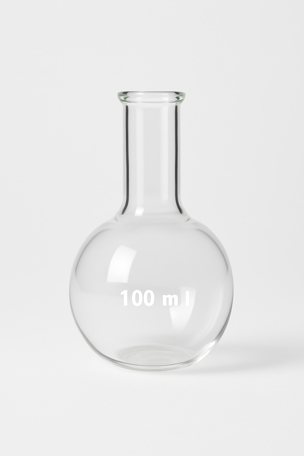 A Round/Flat Bottom Flask 100 ml is a laboratory glass container used for mixing, heating, and storing liquids in moderate small volumes. The round bottom flask has a spherical body that allows uniform heating, making it ideal for chemical reactions and distillation processes. The flat bottom variant offers stability on flat surfaces, suitable for resting or heating without additional support. Both have a narrow neck which helps minimize evaporation and contamination. Key features: Capacity: 100 ml Design: Round spherical bottom or stable flat bottom with a narrow neck Material: Borosilicate glass, resistant to heat and chemical corrosion Applications: Suitable for heating, reflux, distillation, mixing, and sample storage in research, educational, and industrial labs Benefits: Round bottom for even heating; flat bottom for ease of placement without support apparatus; narrow neck to control environmental exposure This flask is essential for precise and safe handling of liquids in laboratory procedures requiring heat application and controlled environments.