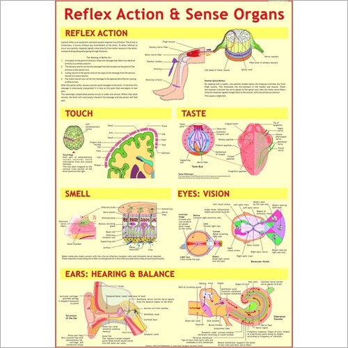 The “Sense Organs & Reflex Action (70x100cm)” chart is a large-format educational wall poster that provides visual explanations of the structure and function of the five primary sense organs as well as the basic neural pathway of reflex actions. This chart is widely used in biology classrooms and laboratories for teaching the fundamentals of sensory perception and rapid involuntary responses.​ Key Features The poster typically displays labeled diagrams of the five main sense organs: eyes (sight), ears (hearing), nose (smell), tongue (taste), and skin (touch), often showing the organ’s structure and associated sensory receptors.​ For each sense organ, it highlights the stimulus detected, the part of the body involved, and the main action (e.g., seeing with the eye, hearing with the ear).​ The chart illustrates the biological pathway of a reflex action—commonly known as the reflex arc—which includes stimulus detection at a receptor, transmission through sensory and motor neurons, and instant response by effectors (muscles or glands).​ Diagrams of the reflex arc emphasize the components: receptor, sensory neuron, relay neuron/spinal cord, motor neuron, and effector, showing a rapid, automatic, and protective response (such as hand withdrawal from a hot surface).​ Educational Use The large (70x100cm) size makes the diagrams and labels easy to see in group teaching scenarios or presentations.​ This chart is ideal for secondary/high school biology or introductory physiology, helping students understand both sensory processing and the basics of neural circuits.​ It provides a concise overview that connects real-life experiences (reflexes, sensory input) to underlying anatomical and physiological mechanisms