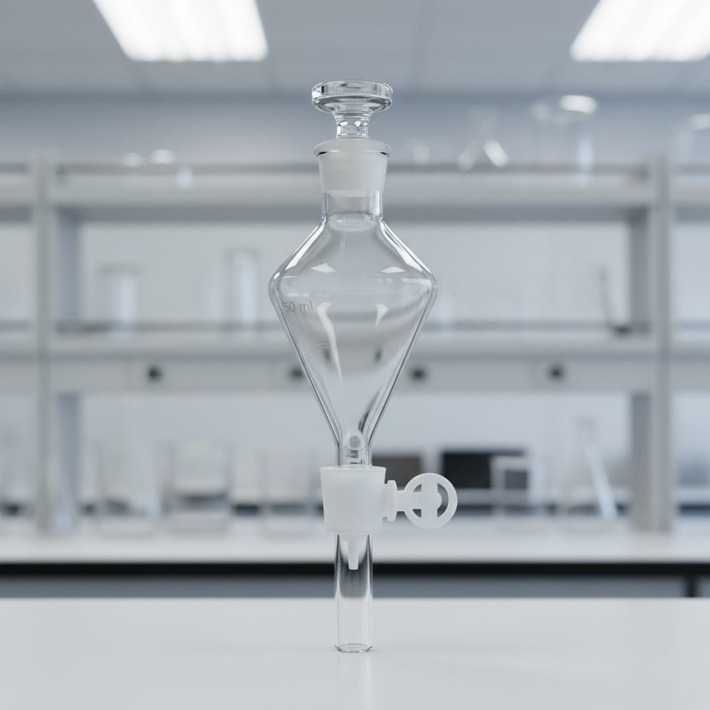 The 50 ml separating funnel with a Rotaflow stopcock is a laboratory glassware piece used for liquid-liquid extractions to separate immiscible liquids of different densities. The Rotaflow stopcock is designed for smooth, controlled flow regulation, allowing precise separation without leaks. This funnel has clear volume markings for accurate measurement and is made of transparent material to allow easy observation of phase separation during the process. It is essential in chemical laboratories for sample preparation and purification.
