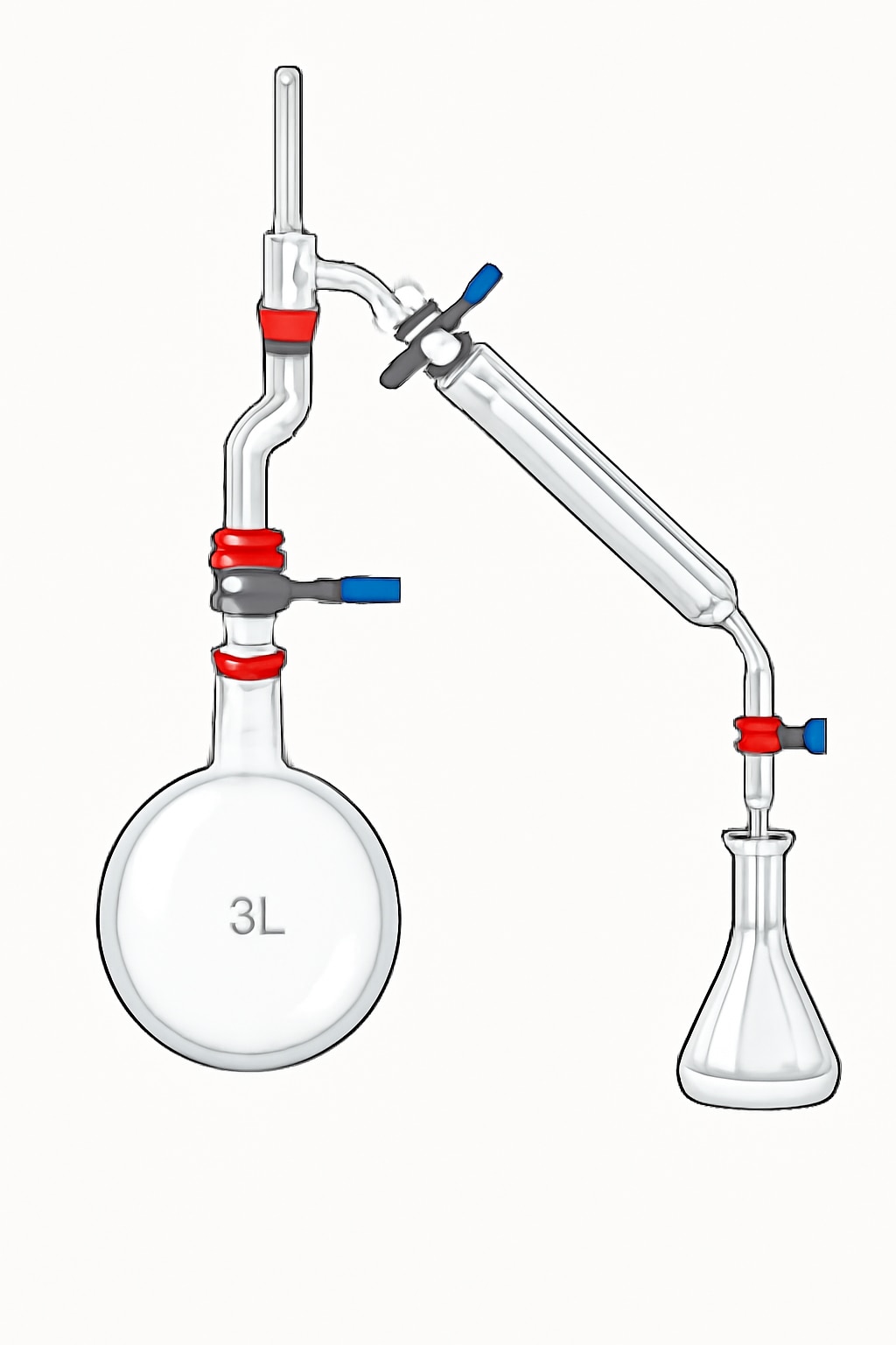 The single-stage distillation apparatus with a 3-liter flask capacity and without a cut-off is a simplified laboratory glassware setup used for the extraction and separation of volatile compounds. The 3-liter flask provides a moderate volume for processing samples, suitable for small to medium laboratory-scale distillations. Being a single-stage setup means it performs one cycle of evaporation and condensation without intermediate separation stages or cut-off mechanisms. This design is typically used for straightforward distillation tasks where continuous fractionation is not required, focusing on extracting essential oils or similar volatile compounds efficiently with a simpler assembly and easier handling.