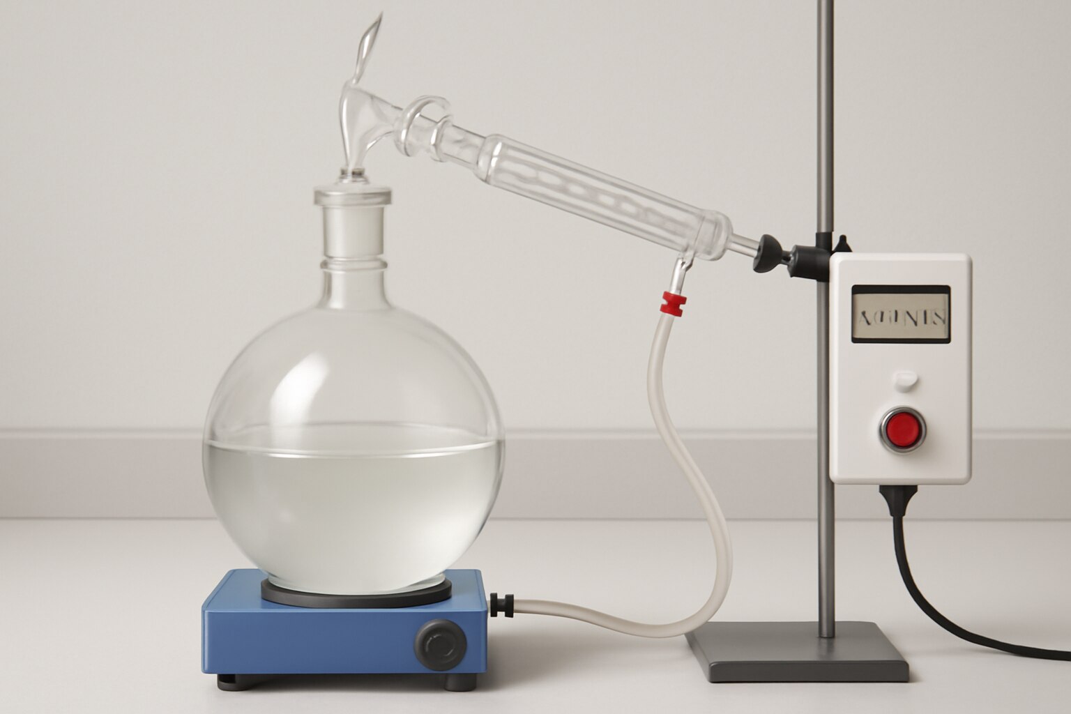 The single still with a 4-liter flask capacity and an automatic cut-off device is a laboratory distillation system designed for precise and safe extraction of volatile compounds. The 4-liter flask allows for moderate batch volumes, providing flexibility for various laboratory distillation needs. The automatic cut-off device enhances operational safety by detecting liquid levels or distillation progress with electrodes and automatically stopping the heating once the process is complete, preventing overheating or overflow. This setup offers efficient distillation with minimal manual intervention, making it suitable for essential oil extraction or other applications requiring controlled distillation cycles with reliable cut-off functionality.