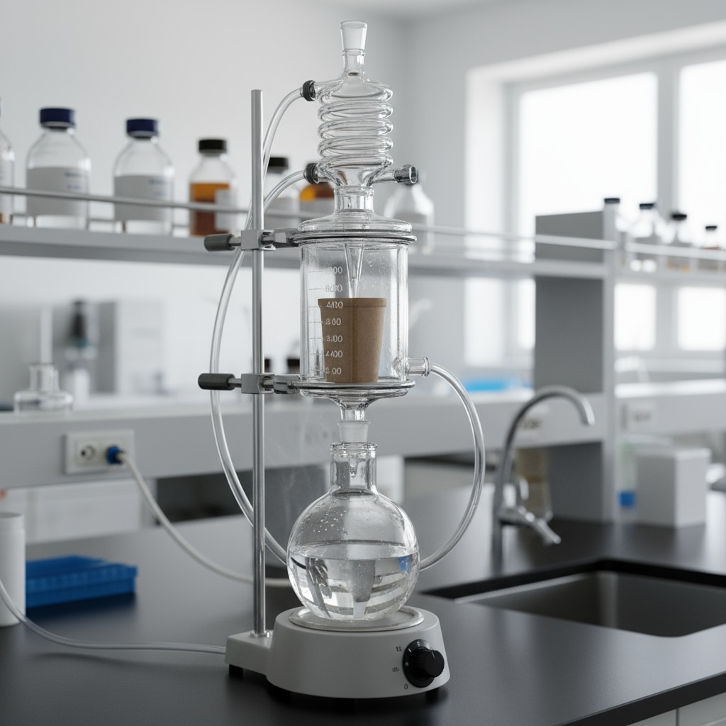 The Soxhlet apparatus is a laboratory piece of equipment designed for efficient and continuous extraction of a desired compound from solid materials using a solvent. It consists of an extraction chamber where the solid sample is placed, connected via glass tubes to a heating flask holding the solvent (commonly 100 ml, 200 ml, or 400 ml chambers matched with 250 ml, 500 ml, or 1-liter flasks). A condenser sits atop the extraction chamber, cooling vaporized solvent so it condenses and drips back to wash the solid sample repeatedly. This cyclic process allows thorough extraction of compounds without need for constant solvent replenishment. The apparatus is predominantly made from borosilicate glass for thermal resistance and durability during reflux heating. Soxhlet extraction is widely used in chemical, environmental, and biological labs for isolating oils, fats, and other analytes from solids.