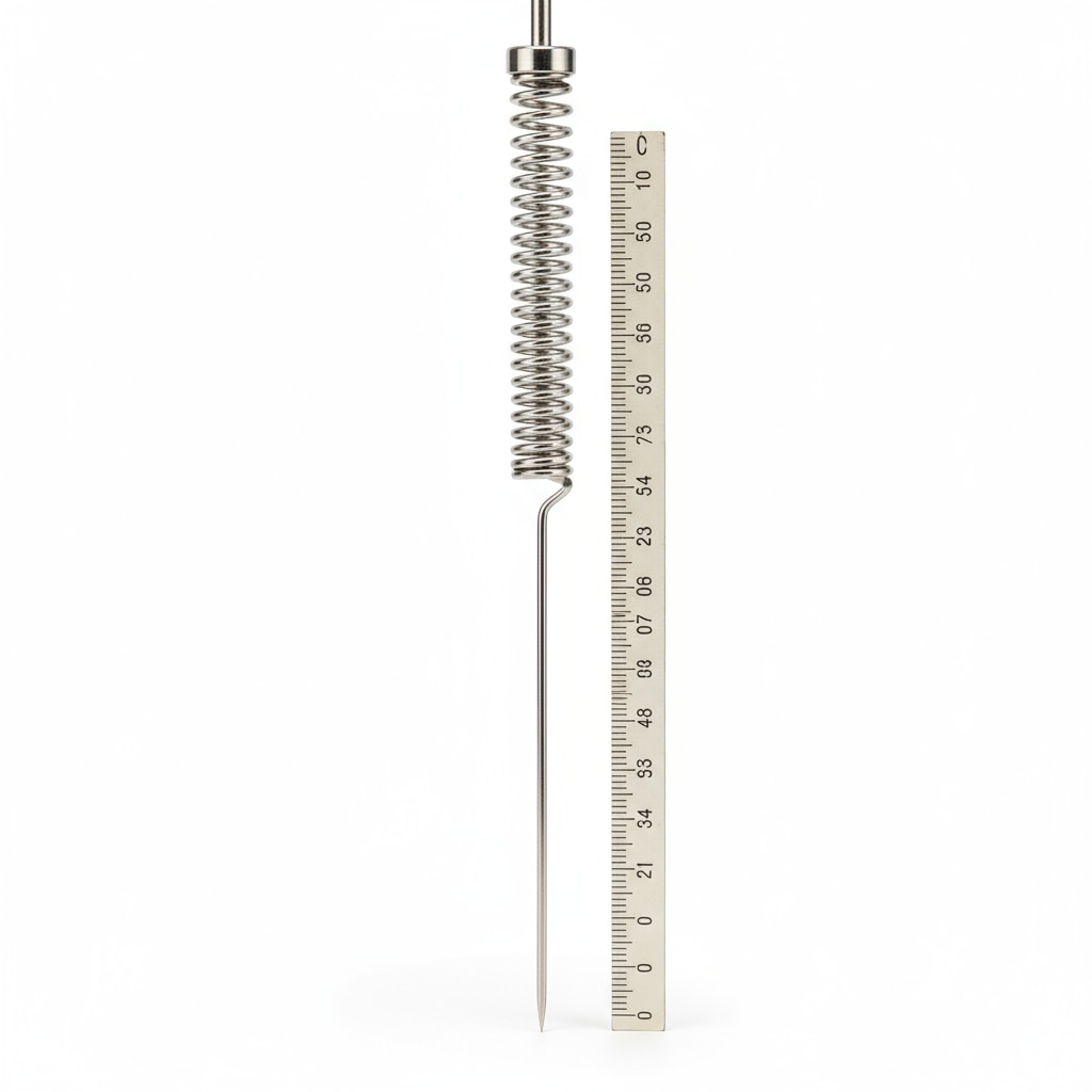 Description It consists of a helical metal spring fitted with a fine metal pointer attached to the spring coil. The pointer is used to indicate the spring’s extension or compression on a scale, allowing precise measurement of displacement during experiments. This apparatus is part of the Nuffield Physics program, which emphasizes high-quality, economical equipment for educational use in schools and colleges. Features and Uses The spring exhibits elastic behavior according to Hooke’s Law. The metal pointer enhances accuracy by providing a clear visual indicator of spring extension. It is commonly used in physics classrooms and labs to help students study the relationship between force and displacement in springs. Designed for repeated use and durability, making it ideal for student experiments. This straightforward yet effective tool is essential for understanding spring mechanics and forms a core part of physics lab practicals in education.