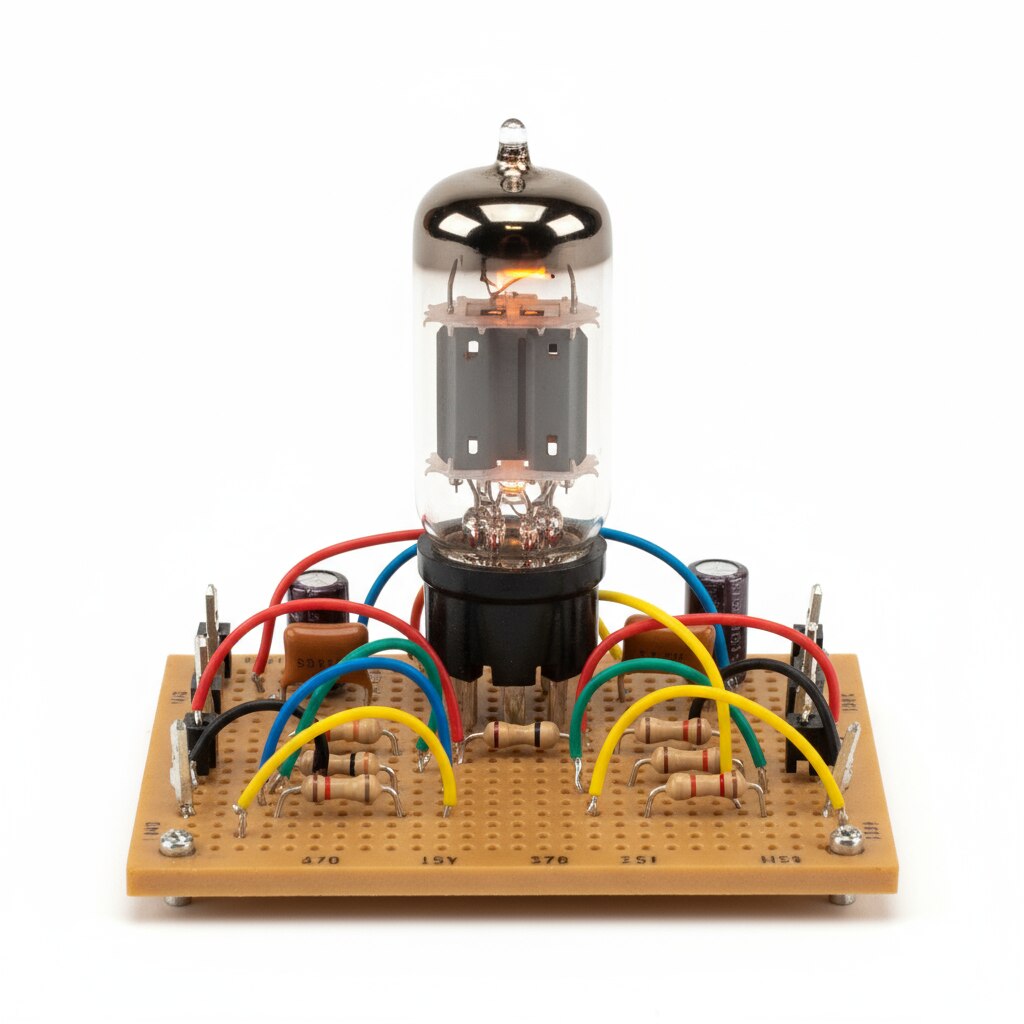 The Tetrode/Pentode Valve (6SJ7) on board is a high-gain sharp cutoff pentode vacuum tube widely used as a voltage amplifier and detector in radio frequency (RF) and audio frequency (AF) applications. It features an octal base and metal or glass envelope, offering stable performance and a distinctive design. Key Features Design: Sharp cutoff pentode with five active electrodes—cathode, control grid, screen grid, suppressor grid, and plate (anode), providing high gain and low distortion. Heater Voltage: 6.3V with 0.3A heater current, suitable for easy integration into typical electronic circuits. Maximum Plate Voltage: Approximately 300V, with a maximum plate dissipation around 2.5W and screen dissipation 0.7W. Amplification: Provides substantial voltage gain making it ideal for low-level signal amplification in both audio and RF domains. Grid and Screen Characteristics: Includes internal shielding and a suppressor grid for minimizing secondary emissions and improving linearity. Package: Typically housed in a metal or glass envelope with an octal 8-pin base for convenient socket mounting. Applications: Suited to biased detection, high-gain amplification, RF amplification, and as a preamplifier in audio circuits and radios. Operational Notes Known for variable screen and plate currents with flexible biasing that impacts gain and linearity. Popular in vintage and restoration electronics due to its characteristic sound and amplification qualities. Used in push-pull and single-ended amplifier configurations depending on circuit design. This 6SJ7 tetrode/pentode valve on board serves as a reliable high-gain amplification component for RF and audio applications, combining classic vacuum tube engineering with versatile usage in experimental and professional electronics