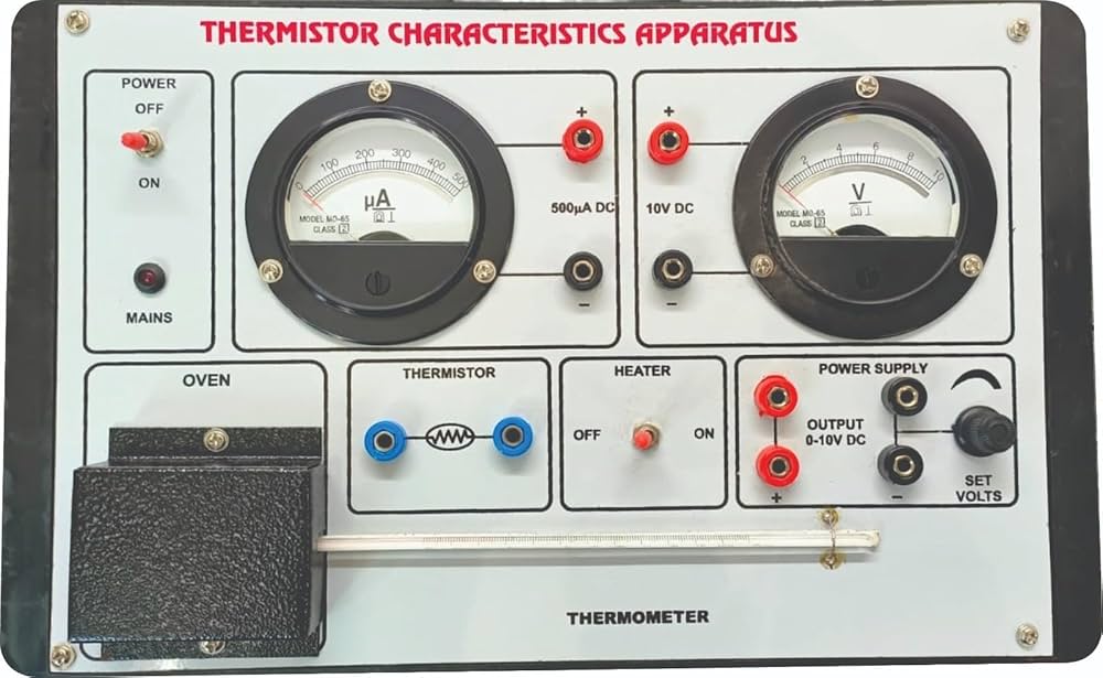 The Thermistor Characteristics Apparatus is a laboratory setup used to study how the resistance of a thermistor changes with temperature, providing insights into its negative temperature coefficient (NTC) or positive temperature coefficient (PTC) behavior. Apparatus Description Components: The apparatus generally includes a thermistor (commonly NTC type), a regulated DC power supply (0–10 V), two digital or analog meters for voltage and current measurement, and a heating arrangement such as an electrically heated oven or water bath with a glass/mercury thermometer to control and monitor temperature. Principle and Working The thermistor is a temperature-sensitive resistor, whose resistance changes significantly with temperature - an NTC thermistor’s resistance decreases as temperature increases, while a PTC thermistor’s resistance increases. The thermistor is connected in a circuit so that its resistance can be monitored as the temperature is systematically changed using the heating arrangement. Experimental Procedure The thermistor is placed inside the oven or bath, and the circuit is completed for resistance measurement. The temperature is increased in steps, and for each temperature setting, the corresponding resistance of the thermistor is recorded using the voltmeter-ammeter readings (Ohm’s law). A graph of resistance versus temperature is plotted, which typically shows the characteristic exponential drop for NTC thermistors. Applications This experiment demonstrates the rapid resistance-temperature response of thermistors, foundational to their use in temperature measurement, compensation, and control systems.