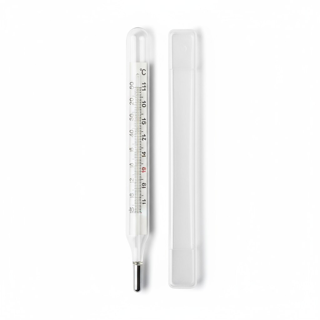 Mercury Thermometers with a measurement range of -10 to 110°C are precision instruments used for accurate temperature readings in various environments. These thermometers consist of a slender glass tube filled with mercury, whose thermal expansion varies with temperature, allowing readings against a calibrated scale. Each thermometer is individually enclosed in a protective plastic case to ensure safe storage and durability. Mercury thermometers are favored for their high accuracy, clear visibility, and long-lasting performance despite precautions required due to mercury's toxicity. The generated image shows a clear mercury thermometer with silver-colored mercury and its accompanying plastic protective case isolated on a white background