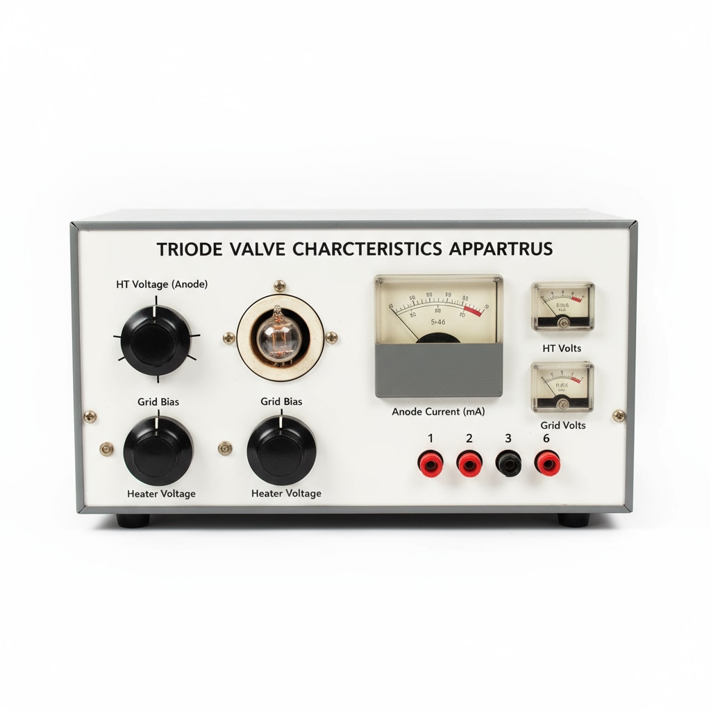 A Triode Valve Characteristics Apparatus is a specialized laboratory instrument designed to investigate the electrical properties and behavior of triode vacuum tubes (triode valves). It typically includes mounting sockets for triode tubes, regulated DC power supplies for anode voltage (0-300 VDC) and filament voltage (6.3V AC), and analog meters for measuring plate voltage and current. Components and Function Triode Vacuum Tube Socket: Holds the triode valve in place for electrical testing. DC Regulated Power Supply: Provides adjustable high voltage to the anode to vary tube operation. AC Power Supply: Supplies filament or heater voltage to the cathode for thermionic emission. Measurement Instruments: Voltmeters and ammeters allow observation of voltage and current to plot characteristic curves. Control Knobs and Switches: Enable fine control of voltages and testing modes for experimentation. Purpose and Usage Shows the current-voltage (I-V) characteristics of triode valves under different bias voltages and anode voltages. Demonstrates amplification, control grid function, cut-in voltages, and plate current modulation. Used extensively in electronics education and research laboratories to better understand triode operation. Facilitates hands-on learning about the role of each electrode and tube parameters like transconductance and amplification factor. This apparatus provides critical insights into triode valve physics and operation, supporting the teaching and practical application of vacuum tube electronics.