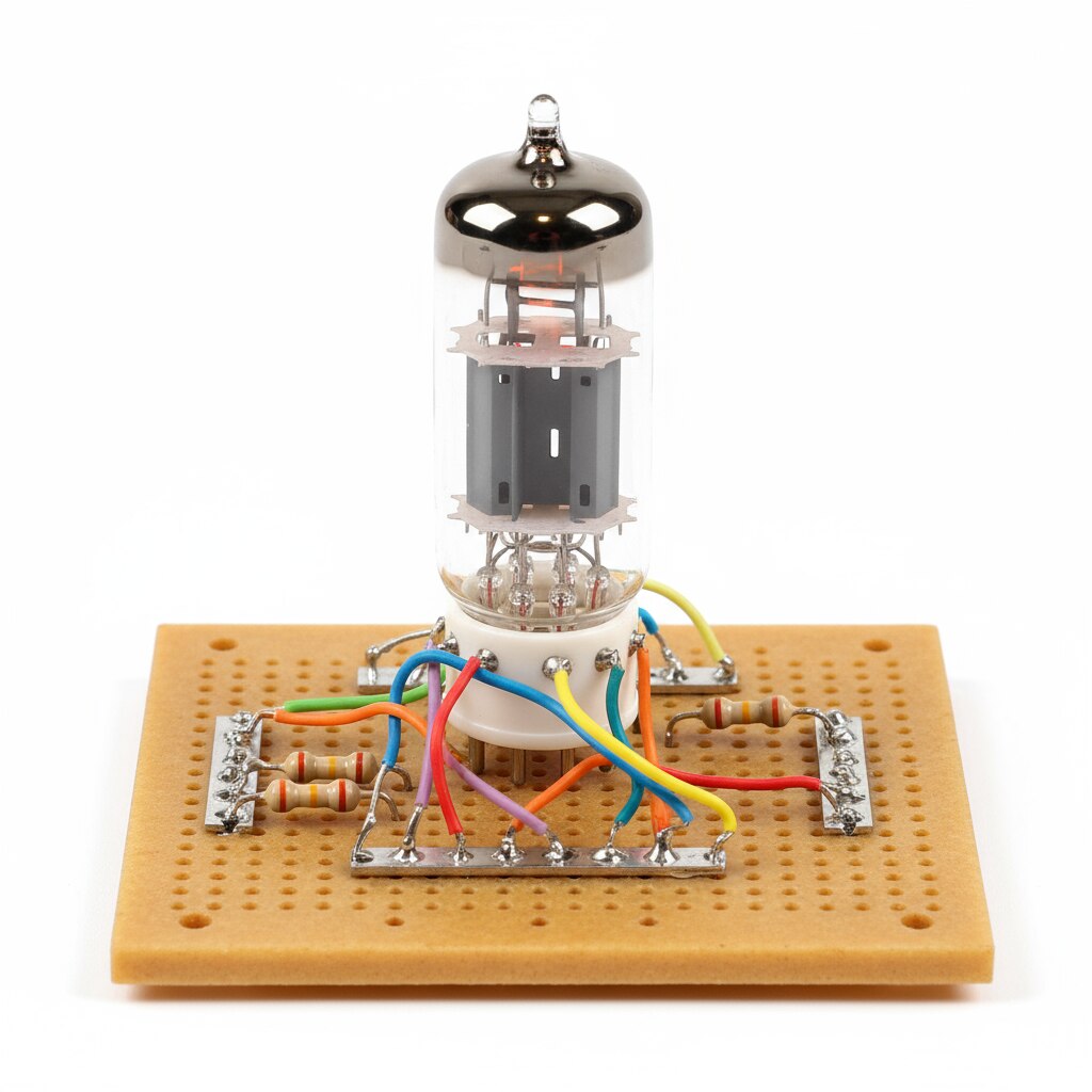 The Triode Valve (ECC82) on board is a classic dual triode vacuum tube commonly used in audio and signal amplification circuits. It is also known as 12AU7 and is prized for its balanced gain and low noise characteristics. Key Features Dual Triode Design: Contains two independent triodes within one glass envelope, each with separate cathode, grid, and plate electrodes. Heater Voltage: Can operate at either 6.3V or 12.6V heater voltages, with heater currents of 300mA (6.3V) or 150mA (12.6V). Amplification Factor: Approximately 17, offering moderate gain suited for audio preamplification and phase splitting. Plate Voltage: Maximum plate voltage around 250-300V, with plate dissipation up to 2.75W, enabling reliable operation in audio and low-frequency circuits. Transconductance: Around 2.2 mA/V, contributing to stable and linear amplification behavior. Package: Noval 9-pin glass envelope commonly used in vintage and modern audio circuits. Applications: Widely used in hi-fi preamplifiers, guitar amplifiers, microphone preamps, and other audio signal processing devices. Operational Aspects Heater-cathode voltage tolerance is around 180V, and the device offers high grid resistance for effective signal handling. The valve operates at typical currents of about 10.5mA per triode with moderate plate voltages ensuring low distortion and clean sound reproduction. Due to its dual triode design, it is often used for push-pull circuits and phase splitting in amplifiers. This ECC82 triode valve on board provides a classic, reliable component well-suited for audio amplification and signal processing tasks in various electronic and musical equipment.