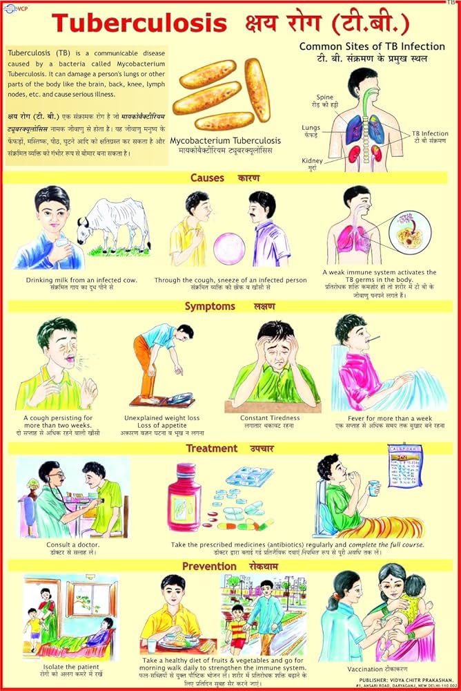 The “Tuberculosis (50x70cm)” educational chart is a bilingual, laminated visual guide that explains the causes, symptoms, transmission, prevention, and treatment of TB using simple graphics and clear language suitable for classrooms, clinics, and community spaces.​ Chart Features Size: 50x70 cm, with durable lamination and often both English and Hindi text, including clear, color-coded sections and diagrams.​ What is Tuberculosis (TB)? TB is a bacterial infection (mainly by Mycobacterium tuberculosis) that most commonly affects the lungs (pulmonary TB), but can involve other organs.​ Transmission: Spread through the air when a person with active pulmonary TB coughs, sneezes, or talks, releasing droplets containing the bacteria.​ TB is NOT spread by touch, food, drink, or sharing household items.​ Symptoms: Persistent cough (over 2 weeks) Coughing up blood Fever, night sweats, and chills Weight loss and fatigue Chest pain and difficulty breathing.​ Prevention: Early diagnosis and completion of full TB treatment Cover mouth/nose when coughing or sneezing Good ventilation in living/working areas BCG vaccination in infancy (in many countries) Isolate persons with active TB until noninfectious.​ Treatment: Multiple antibiotics for at least 6 months as directed by a physician (Directly Observed Treatment, DOT, is standard in many areas).​ Early and complete treatment cures TB, reduces mortality, and prevents the spread.​ May show a diagram of healthy vs. TB-infected lungs, the TB transmission cycle, and key reminders for medicine adherence and stopping infection.​ Educational Value Raises TB awareness and counters myths and stigma, promoting early care-seeking and effective infection control.​ Essential for biology, health, and social science classes as well as public health outreach. Supports DOTS, TB screening campaigns, and World TB Day initiatives with concise, reliable information.​ This chart is an important tool for controlling TB in the community and empowering students, families, and patients with actionable knowledge.​