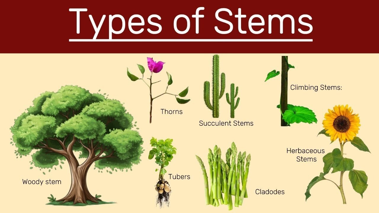Stems are the plant organs responsible for supporting leaves, flowers, and fruits, and for transporting water, nutrients, and food throughout the plant. Plant stems exist in several main types based on their characteristics, location, and adaptations.​ Main Types of Stems Herbaceous Stems: Soft, green, and flexible stems found mainly in herbs and small plants. Examples include mint, coriander, and spinach.​ Woody Stems: Hard, brown, and rigid stems typical of shrubs and trees, like mango, neem, and oak. Woody stems are perennial and support large, tall growth.​ Climbers and Creepers: Weak stems that either climb with support (climbers like pea and grapevine) or spread along the ground (creepers like pumpkin and watermelon).​ Underground Stems: These grow beneath the soil surface and serve for storage, vegetative propagation, or perennation. Examples: rhizome (ginger), tuber (potato), bulb (onion), and corm (colocasia).​ Subaerial Stems: Partly underground and partly above ground. Examples: runners (strawberry), stolons (mint), and offsets (water hyacinth).​​ Aerial Stems: Grow above ground and may be modified for storage, defense, or photosynthesis. Specialized forms include thorns (Bougainvillea), tendrils (pea), phylloclades (Opuntia), and cladodes