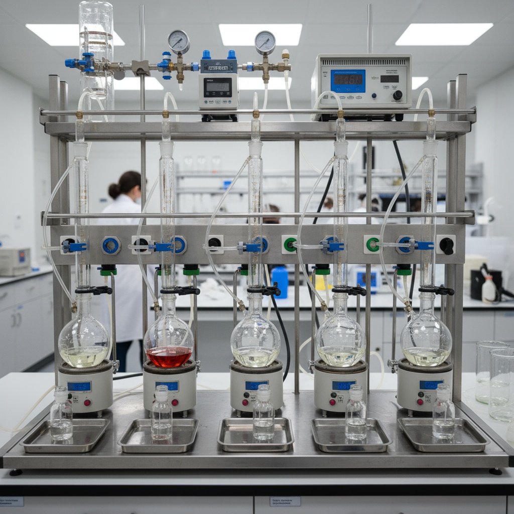 The unit for 6 tests with glass parts is a laboratory apparatus designed to perform six parallel experimental setups using glassware components such as condensers, receivers, and connecting tubes. The inclusion of glass parts allows for clear observation of reactions, excellent chemical resistance, and precise control of experimental conditions. Each position within the unit can accommodate standard laboratory glass assemblies, making it ideal for simultaneous titrations, distillations, or other chemical processes requiring visibility and inertness. This equipment is commonly used in quality control, educational labs, and research environments where multiple samples must be processed or compared under identical conditions and where glass provides safety and performance advantages over other materials.