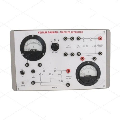 Description Principle: This apparatus operates by successively charging capacitors through diodes during different phases of an AC input cycle, effectively stacking voltages and converting AC to higher-level DC outputs beyond the input peak value. Apparatus Construction: Includes a set of diodes and capacitors arranged in classic voltage multiplier configurations. The doubler circuit uses two stages—each with a diode and capacitor—to produce an output approximately twice the peak AC input voltage. The tripler circuit extends the doubler concept with an additional diode-capacitor stage, yielding about three times the input peak voltage. Robust terminals and a clear layout enable safe connections to an AC source and measurement instruments. Operation: When powered by AC, each stage charges its capacitor in sequence, with rectifiers directing current flow such that the DC output at the end of each stage is a cumulative sum of charged voltages. Output voltage can be measured and compared to theoretical values, illustrating practical applications of voltage multiplication for electronic circuits. This apparatus is essential for experiments in rectification, AC-to-DC conversion, and power electronics, providing hands-on experience with voltage multiplier design and analysis.The Voltage Doubler & Tripler Circuit apparatus is designed for demonstrating the principles of voltage multiplication using capacitor-diode networks in laboratory experiments. Description This circuit utilizes multiple stages of diodes and capacitors to increase the peak output DC voltage derived from an AC input. For the doubler configuration, two capacitors and two diodes are arranged so the output is nearly twice the input peak voltage after rectification. For the tripler, the setup adds another stage, giving nearly three times the input peak voltage. The apparatus features rugged mounting, clear terminals, and is suitable for safe, repeatable experiments showing practical applications in power electronics for generating higher voltages from standard AC sources. This device is important for hands-on learning about voltage multipliers and is widely used in electronics education and experimentation.