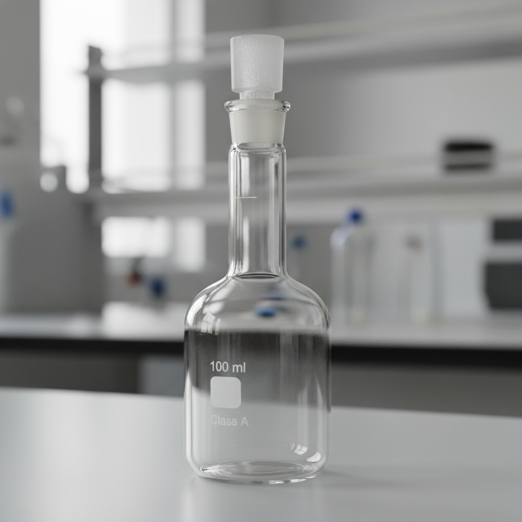 - This 100 ml volumetric flask is designed for precision liquid measurement and solution preparation in scientific laboratories. - The plastic stopper provides an airtight seal to prevent contamination and evaporation, ensuring the integrity of the solutions. - Its narrow neck and clear volume markings facilitate accurate liquid measurement and solution preparation.