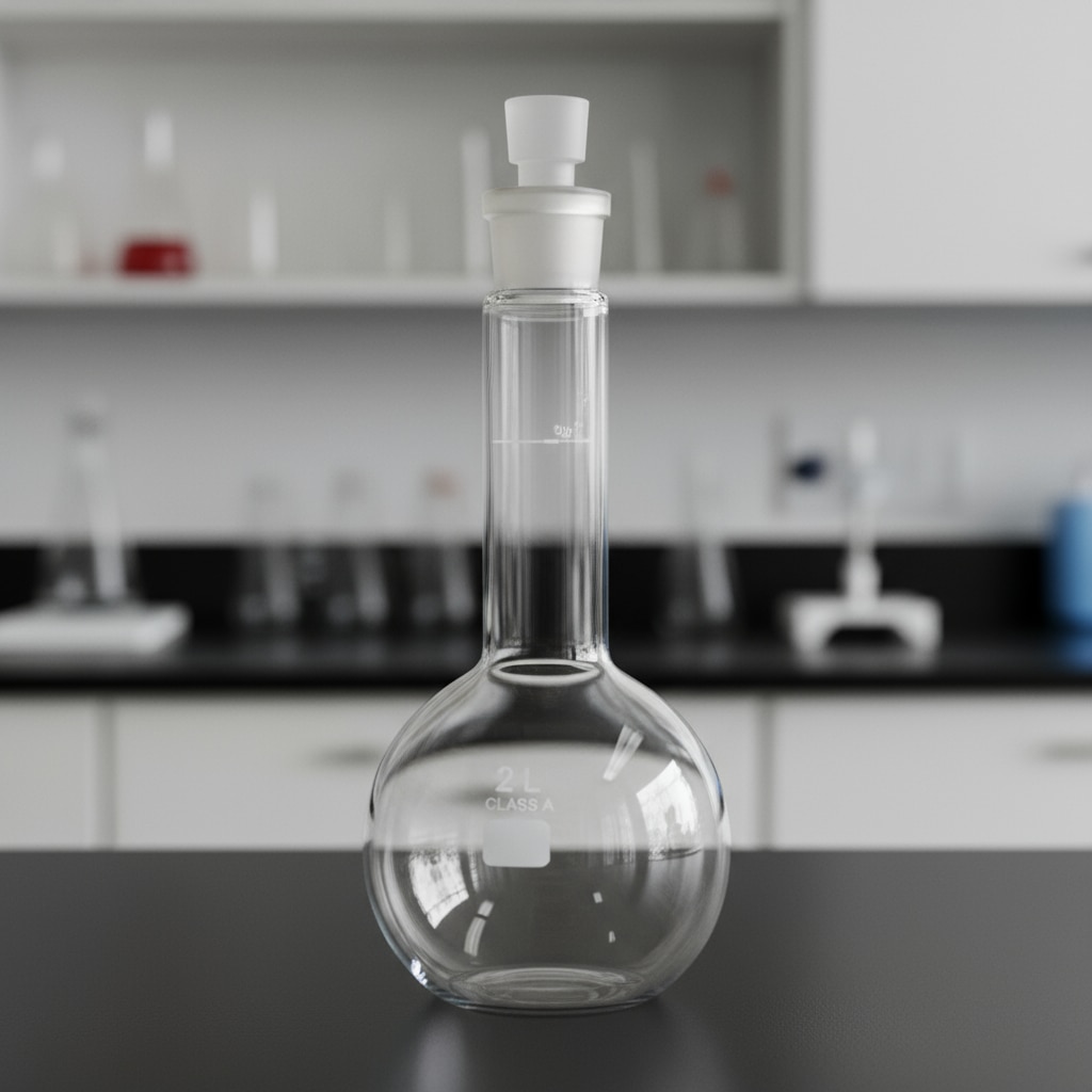 The image shows a clear 2 liter volumetric flask with a plastic stopper for secure sealing(see the generated image above). ### Description - This 2-liter volumetric flask is designed for precise preparation and measurement of liquid solutions in laboratory and scientific environments. - The plastic stopper provides an airtight seal to prevent contamination and evaporation of the flask's contents. - Its narrow neck and accurate volume markings allow for reliable and precise solution preparation and liquid measurement.