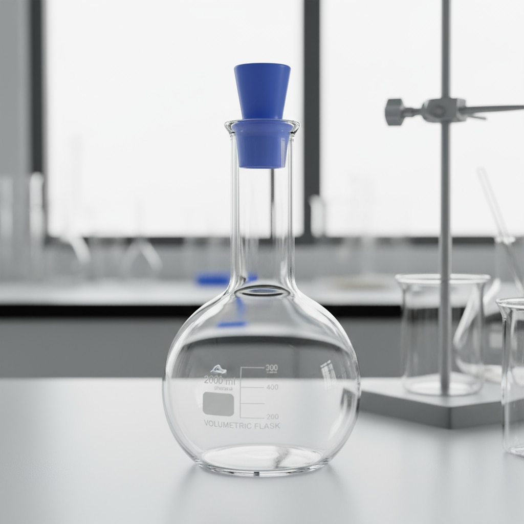 A Volumetric Flask with Plastic Stopper and 2 liters capacity is a precise laboratory glassware item used for accurate volumetric measurement and preparation of chemical solutions. It is made from high-quality borosilicate glass 3.3, conforming to ISO 1042 and DIN 12664 standards, offering excellent chemical resistance, thermal durability, and minimal thermal expansion. Key Features Constructed from borosilicate glass 3.3 with durable blue printed graduations. Class A accuracy with typical tolerance of ±0.6 ml at 20 °C. Pear-shaped, flat-bottomed flask with a long narrow neck. Equipped with a polypropylene or polyethylene plastic stopper for secure, chemical-resistant sealing. Standard neck size 29/32 with ground joint for precise fit. Typical dimensions include approximately 370 mm height and 125 mm diameter. Single etched or screen-printed graduation mark on the neck indicating precise volume. Supplied with batch number and individual calibration certificate to ensure traceability and quality. Autoclavable without stopper for laboratory sterilization procedures. Ideal for scientific, clinical, educational, and industrial laboratory applications requiring precision volumetric analysis, dilutions, and solution preparations. This volumetric flask is a critical tool for ensuring accurate liquid handling, measurement, and preparation in professional laboratory environments with robust durability and safety.
