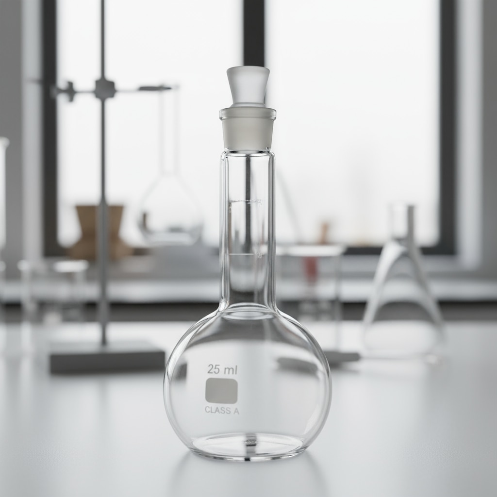 The image shows a clear 25 ml volumetric flask with a plastic stopper for secure sealing(see the generated image above). ### Description - This 25 ml volumetric flask is designed for accurate liquid measurement and solution preparation in laboratory settings. - The plastic stopper provides an airtight seal to prevent contamination and evaporation. - It features a narrow neck and precise volume markings to ensure precise and reliable results in experiments and liquid handling.