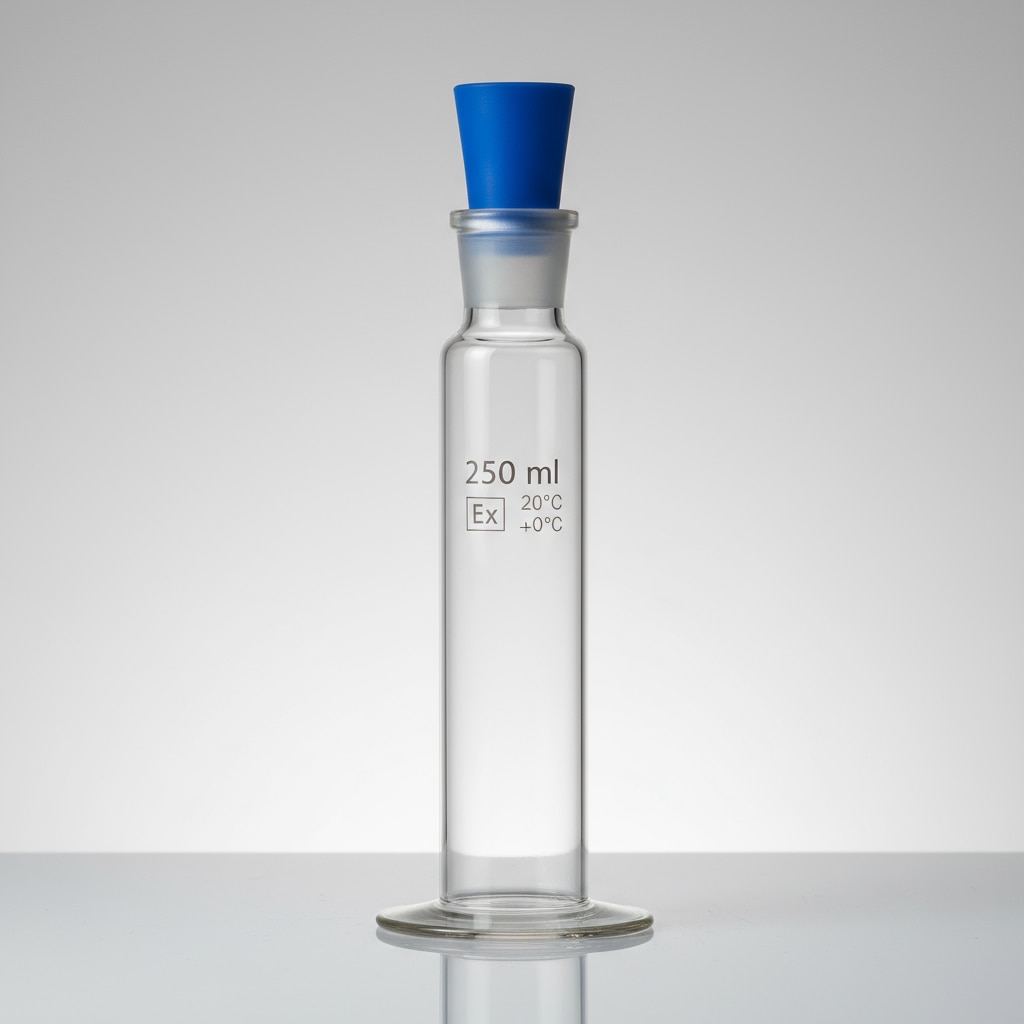 A Volumetric Flask with Plastic Stopper and 250 ml capacity is a precision laboratory glassware instrument used for accurate measurement and preparation of chemical solutions. It is made from clear borosilicate glass conforming to ISO 1042 and DIN 12664 standards, known for its excellent chemical resistance and low thermal expansion. Key Features Made of high-quality borosilicate glass 3.3 with blue printed graduations. Class A accuracy with a tolerance of ±0.15 ml at 20°C. Features a flat-bottomed, pear-shaped body with a long narrow neck. Equipped with a plastic stopper made of polyethylene (PE) or polypropylene for secure sealing. Ground-glass neck with a standard 14/23 joint. Height approximately 220 mm with a diameter of about 80 mm. Graduated with a single etched or screen-printed mark indicating exact volume. Supplied with batch number and individual calibration certificate. Suitable for precise volumetric measurements, solution preparations, and dilutions in scientific, educational, and industrial labs. This flask ensures reliable volumetric accuracy and durability, making it essential for laboratory quantitative tasks.
