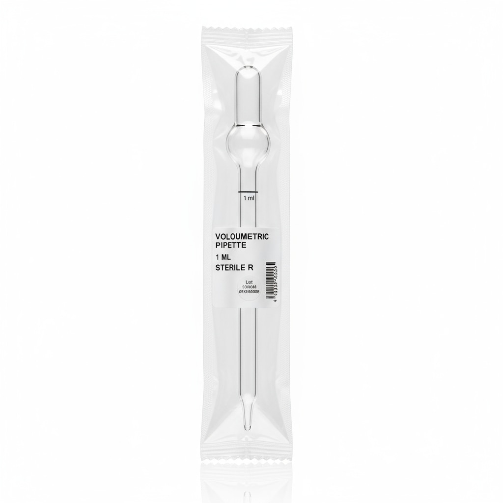 A 1 ml volumetric pipette is a precision laboratory glassware instrument designed to deliver a fixed, highly accurate volume of liquid, typically calibrated to deliver with an accuracy up to four significant figures. It has a large bulb with a long, narrow tube and a single graduation mark indicating the fixed volume it measures. These pipettes are usually made of clear borosilicate or soda-lime glass and sometimes come in amber versions for light-sensitive samples. The 1 ml size is commonly used in analytical chemistry for preparing solutions, titrations, and other routine liquid handling tasks in laboratories. It is calibrated “to deliver” (TD) and classified typically as Class A for high precision, often conforming to ISO or ASTM standards. These volumetric pipettes provide accurate, reliable measurement, essential for quantitative chemical analysis.
