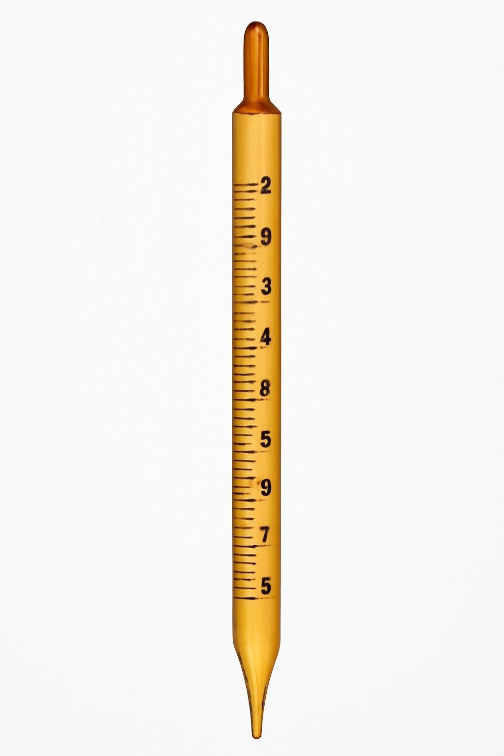 A Graduated Pipette (Amber Color) 10 ml is a laboratory instrument used to precisely measure and transfer volumes of liquid up to 10 milliliters. The amber color provides protection against light exposure, which is necessary when working with photosensitive substances. This pipette features marked graduations to allow accurate measurement and is commonly used in labs for chemical, biological, and medical applications requiring careful volume control.