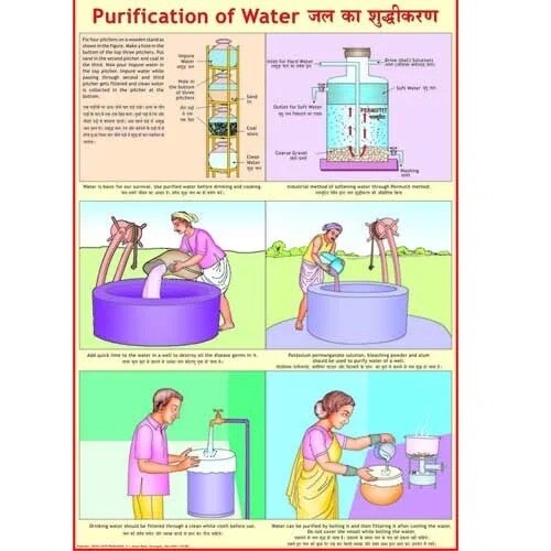 The “Water Purification” (50x70 cm) educational chart clearly illustrates key steps and major methods used to convert contaminated or unsafe water into clean, safe water for drinking and daily use, making it ideal for science classrooms, awareness programs, and educational campaigns.​ Chart Features Size: 50x70 cm, multicolor, and often laminated with English, Hindi, or bilingual labeling for wide accessibility.​ Shows key water purification methods and their sequential flow: Coagulation/Flocculation: Chemicals are added to water to cause suspended particles to clump together (form flocs) for easier removal.​ Sedimentation: The water sits undisturbed so that heavy flocs settle to the bottom for removal.​ Filtration: Water passes through layers of sand, gravel, charcoal, or modern membranes to remove particulate impurities.​ Disinfection: Final elimination of harmful microorganisms using methods such as boiling, chlorination, ultraviolet (UV) treatment, or ozonation.​ Additional household or alternative purification methods: simple boiling, bio-sand filtration, commercial filters (RO, UV), solar disinfection, and chemical tablets.​ Each method is illustrated with process diagrams, example setups (water filter models, RO/UV units), and brief text or icons indicating purpose and effectiveness.​ Educational Value Helps students and community members visually understand the full sequence of water purification and the importance of each stage for public health.​ Teaches low-cost, practical options such as boiling and filtration for home settings, along with the science behind advanced technologies. Supports lessons on sanitation, hygiene, environmental studies, and life skills, and is essential for schools, NGOs, and health campaigns.​ Overall, this poster is a concise and practical visual summary of water purification essentials, empowering learners to understand and apply safe water treatment methods.​