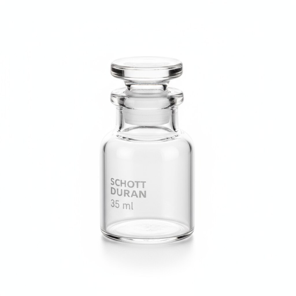 The weighing bottle, squat form, 50x35 mm with 35 ml capacity, is a chemically resistant laboratory glass container made of Borosilicate glass (Boro 3.3) conforming to IS 1574 and ASTM-E 438 standards. It features a squat, low-height design for stability and ease of use on balances during weighing processes. The bottle comes with a glass cap to securely cover and protect the contents. It is commonly used for accurately weighing and handling powders and chemicals in laboratories, valued for its mechanical strength and chemical resistanc