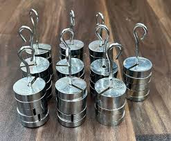 A brass slotted weight set of 50gm inclusive of a hanger and 10 weights of 5gm each is a precision tool used in laboratories and educational settings for experiments involving force, mass, and acceleration.